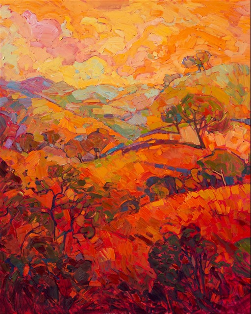 This painting is part of The Orange Show, showing at The Erin Hanson Gallery during the month of October. The piece is available for purchase now, but the painting would be shipped at the end of the exhibition.