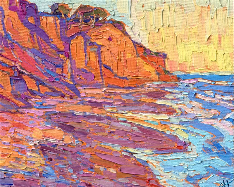Loon Point, in Carpinteria (near Santa Barbara) is captured on a petite canvas with vivid hues of sunset. The brush strokes are loose and impressionistic, alive with color and texture.