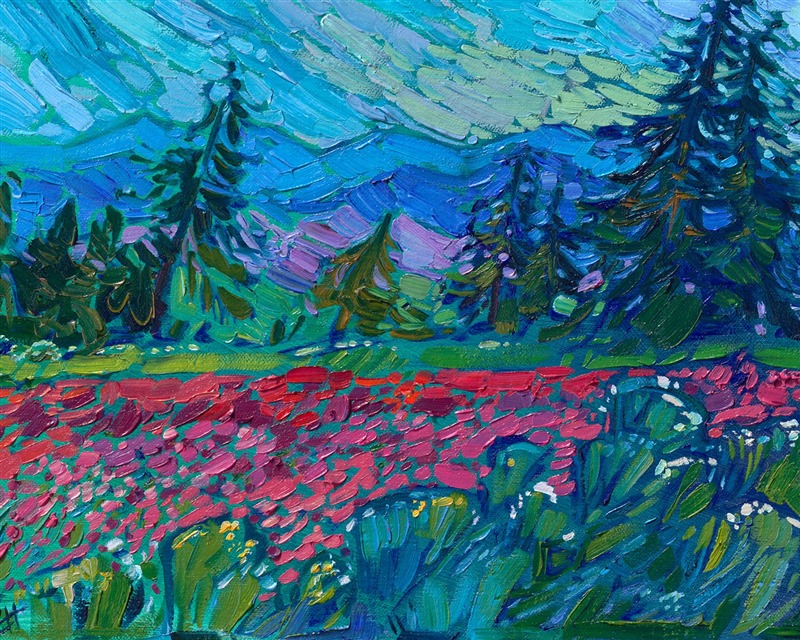 Erin Hanson's canvas prints have the illusion of texture, and they accurately reproduce the brilliant colors of Erin's originals. Canvas prints are printed directly onto canvas rolls using our state-of-the-art Epsom printer. These prints do not have texture applied -- they are flat prints, but they accurately capture the illusion of texture because of the shadows cast by the paint ridges during photography. The canvas prints come rolled, stretched, or framed and ready to hang.