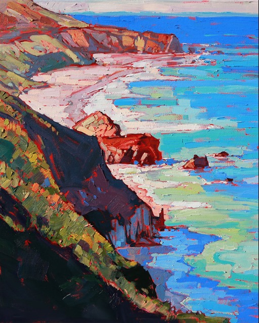Driving south along the 1 Highway, just after dawn, is a beautiful way to soak in the California coast. Since you are driving south, it is easy to pull out into the turnoffs and stand on the edge of a cliff in the crisp ocean air. The aqua-green of the ocean and the cobalt blue of the cliff shadows looked almost unreal in their intensity. With few brush strokes and lots of paint, the artist captures the fresh spontaneity of the oceanscape.