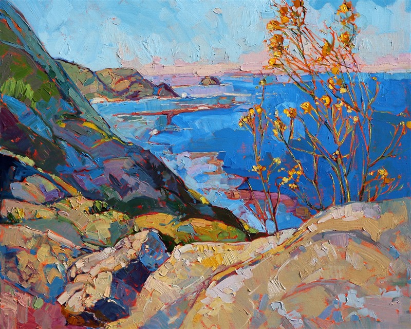 Note on varnishing: Erin’s paintings take six to eight weeks to dry, at which time we apply a retouching varnish, which allows the painting to complete the curing process while having a layer of protection against dirt and scuffs. The full curing process for an impasto oil painting takes at least two years. We are happy to assist in applying a final finishing varnish to your Erin Hanson oil painting once it has been dry for at least two years. Here is more information on how to care for your original oil painting.