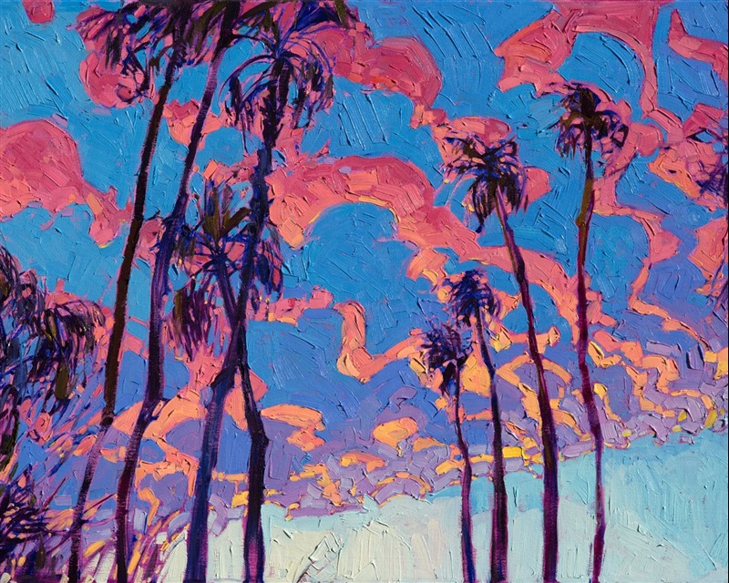Note on varnishing: Erin’s paintings take six to eight weeks to dry, at which time we apply a retouching varnish, which allows the painting to complete the curing process while having a layer of protection against dirt and scuffs. The full curing process for an impasto oil painting takes at least two years. We are happy to assist in applying a final finishing varnish to your Erin Hanson oil painting once it has been dry for at least two years. Here is more information on how to care for your original oil painting.
