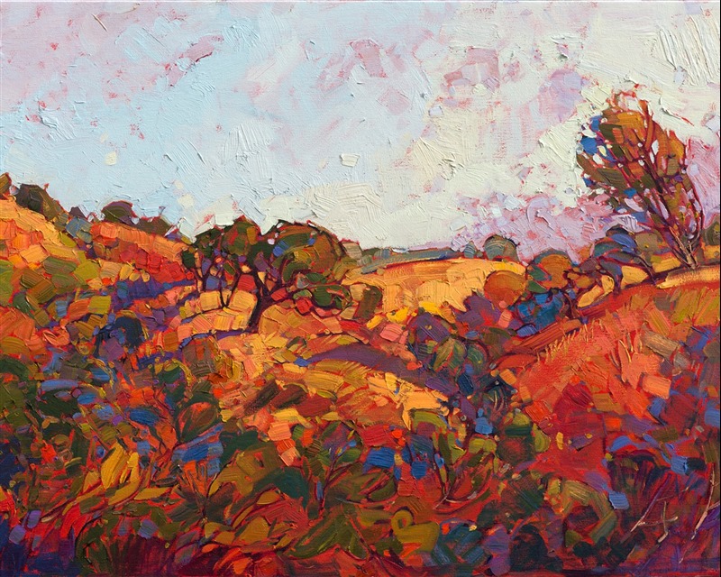 Burgundy and pino wine colors meld deliciously in this oil painting of Paso Robles, California wine country. The warm California colors seem to burst with life and motion, the thick strokes of paint lifting confidently off the canvas. The lavender sky seems to invite you to drowse under a shady oak and watch the fluffy clouds float tranquilly by.