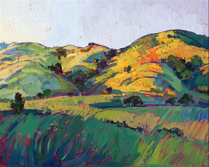 Style: "Open Impressionism" is a new style of painting developed by American artist Erin Hanson. The style is characterized by short, impasto brush strokes that are applied without layering, creating a mosaic or stained-glass appearance to the paintings. The paintings are created with a limited palette of colors, applied without blending or mixing upon the canvas, which adds a dimension of texture to each brush stroke. Inspired by classic impressionism, pointillism, and post-impressionism, Erin Hanson continues the tradition of impressionism into the modern day with her colorful and vivacious landscape paintings.