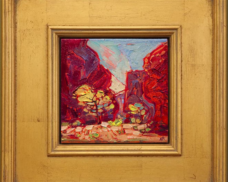 Note on varnishing: Erin’s paintings take six to eight weeks to dry, at which time we apply a retouching varnish, which allows the painting to complete the curing process while having a layer of protection against dirt and scuffs. The full curing process for an impasto oil painting takes at least two years. We are happy to assist in applying a final finishing varnish to your Erin Hanson oil painting once it has been dry for at least two years. Here is more information on how to care for your original oil painting.