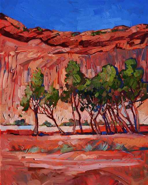 Style: "Open Impressionism" is a new style of painting developed by American artist Erin Hanson. The style is characterized by short, impasto brush strokes that are applied without layering, creating a mosaic or stained-glass appearance to the paintings. The paintings are created with a limited palette of colors, applied without blending or mixing upon the canvas, which adds a dimension of texture to each brush stroke. Inspired by classic impressionism, pointillism, and post-impressionism, Erin Hanson continues the tradition of impressionism into the modern day with her colorful and vivacious landscape paintings.
