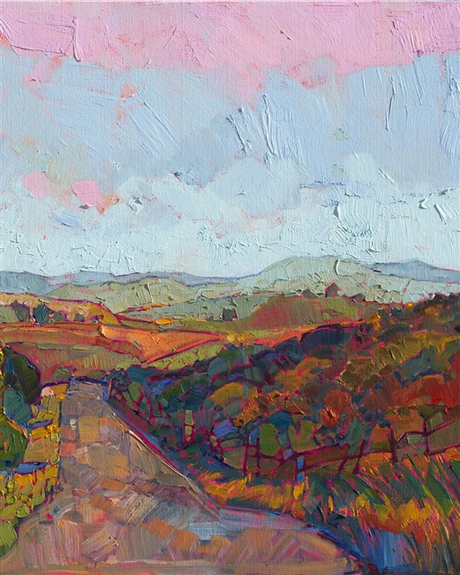 A patchwork of color follows this California road, inspired by driving through the roads of Paso Robles. Unexpected color gleams from the cultivated landscape, drawing your eye deeper into the landscape. This painting is full of beautifully textured oil paint applied in a loose, confident stroke.