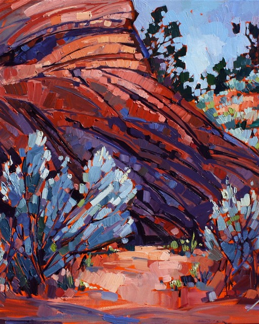 Style: "Open Impressionism" is a new style of painting developed by American artist Erin Hanson. The style is characterized by short, impasto brush strokes that are applied without layering, creating a mosaic or stained-glass appearance to the paintings. The paintings are created with a limited palette of colors, applied without blending or mixing upon the canvas, which adds a dimension of texture to each brush stroke. Inspired by classic impressionism, pointillism, and post-impressionism, Erin Hanson continues the tradition of impressionism into the modern day with her colorful and vivacious landscape paintings.