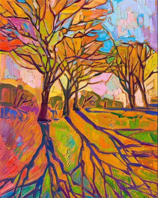 Style: "Open Impressionism" is a new style of painting developed by American artist Erin Hanson. The style is characterized by short, impasto brush strokes that are applied without layering, creating a mosaic or stained-glass appearance to the paintings. The paintings are created with a limited palette of colors, applied without blending or mixing upon the canvas, which adds a dimension of texture to each brush stroke. Inspired by classic impressionism, pointillism, and post-impressionism, Erin Hanson continues the tradition of impressionism into the modern day with her colorful and vivacious landscape paintings.