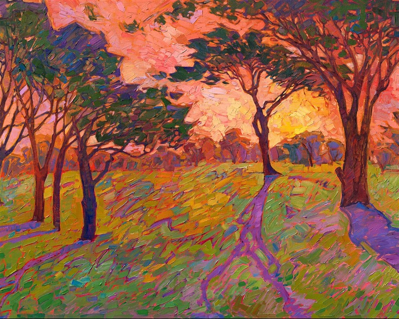Note on varnishing: Erin’s paintings take six to eight weeks to dry, at which time we apply a retouching varnish, which allows the painting to complete the curing process while having a layer of protection against dirt and scuffs. The full curing process for an impasto oil painting takes at least two years. We are happy to assist in applying a final finishing varnish to your Erin Hanson oil painting once it has been dry for at least two years. Here is more information on how to care for your original oil painting.