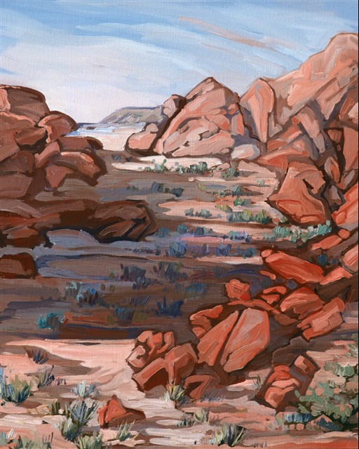 This was one of the first paintings Hanson created of Valley of Fire State Park, where her first landscape exhibition was held in 2007. In this early painting you can see Hanson experimenting with using brush strokes to capture the form and texture of the rocks.