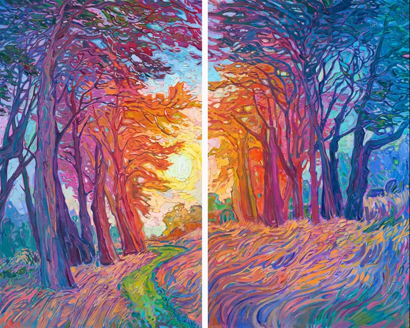 This piece will be on display at Erin Hanson's solo museum show Erin Hanson: Alchemist of Color at the Channel Islands Maritime Museum in Oxnard, California. You may purchase this painting now, but the piece will not be delivered until after the show ends on December 28th, 2023.