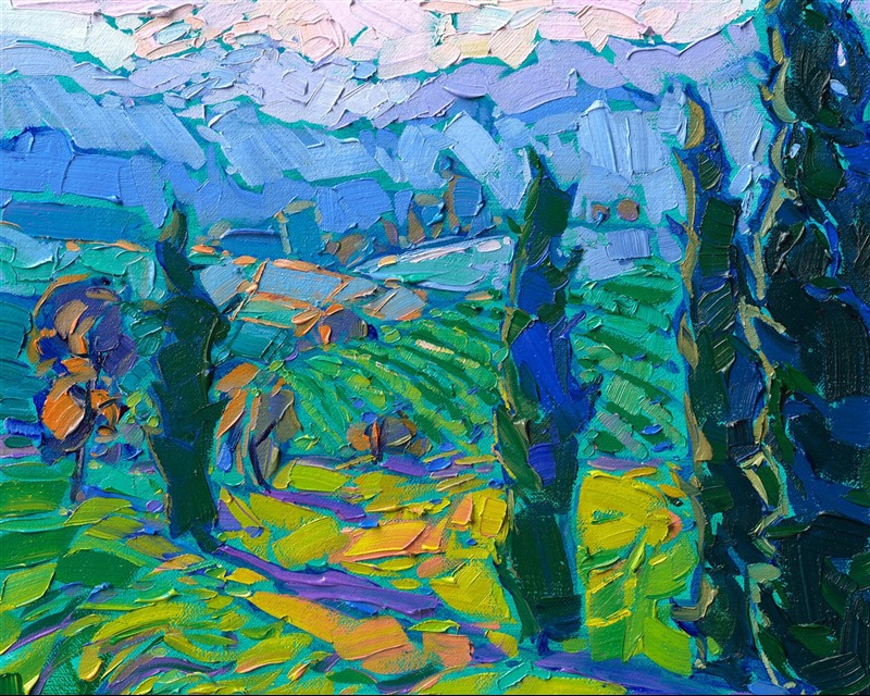 Style: "Open Impressionism" is a new style of painting developed by American artist Erin Hanson. The style is characterized by short, impasto brush strokes that are applied without layering, creating a mosaic or stained-glass appearance to the paintings. The paintings are created with a limited palette of colors, applied without blending or mixing upon the canvas, which adds a dimension of texture to each brush stroke. Inspired by classic impressionism, pointillism, and post-impressionism, Erin Hanson continues the tradition of impressionism into the modern day with her colorful and vivacious landscape paintings.