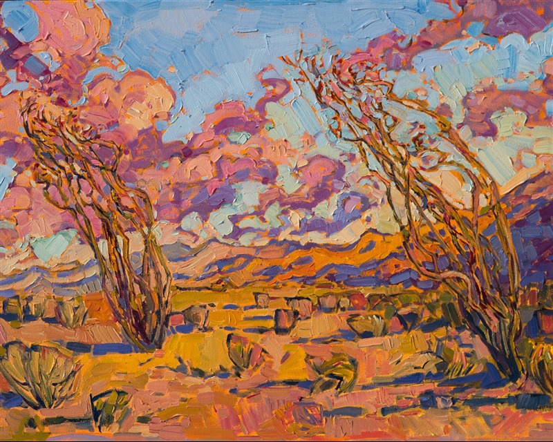 Note on varnishing: Erin’s paintings take six to eight weeks to dry, at which time we apply a retouching varnish, which allows the painting to complete the curing process while having a layer of protection against dirt and scuffs. The full curing process for an impasto oil painting takes at least two years. We are happy to assist in applying a final finishing varnish to your Erin Hanson oil painting once it has been dry for at least two years. Here is more information on how to care for your original oil painting.