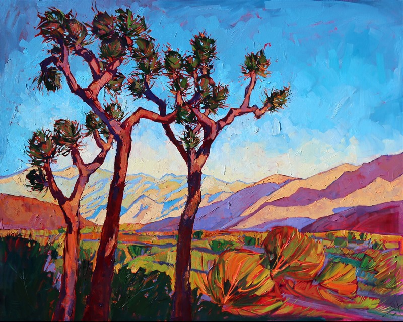 Joshua Tree National Park inspires a true love affair with color. The magnetic colors glow in the red light of early morning. Outdoors, in the crisp morning, one's eyes go into overload to keep track of all the color. This painting is a mere suggestion of the brilliance of real life.