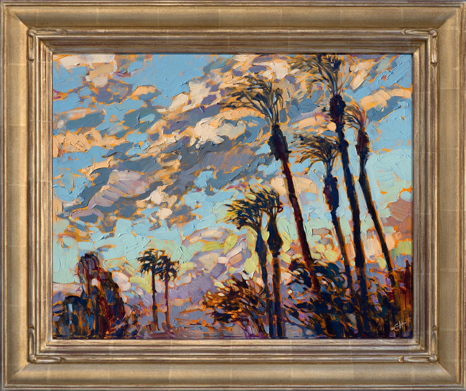 Note on varnishing: Erin’s paintings take six to eight weeks to dry, at which time we apply a retouching varnish, which allows the painting to complete the curing process while having a layer of protection against dirt and scuffs. The full curing process for an impasto oil painting takes at least two years. We are happy to assist in applying a final finishing varnish to your Erin Hanson oil painting once it has been dry for at least two years. Here is more information on how to care for your original oil painting.