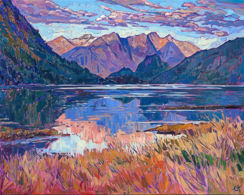 Note on varnishing: Erin’s paintings take six to eight weeks to dry, at which time we apply a retouching varnish, which allows the painting to complete the curing process while having a layer of protection against dirt and scuffs. The full curing process for an impasto oil painting takes at least two years. We are happy to assist in applying a final finishing varnish to your Erin Hanson oil painting once it has been dry for at least two years. Here is more information on how to care for your original oil painting.