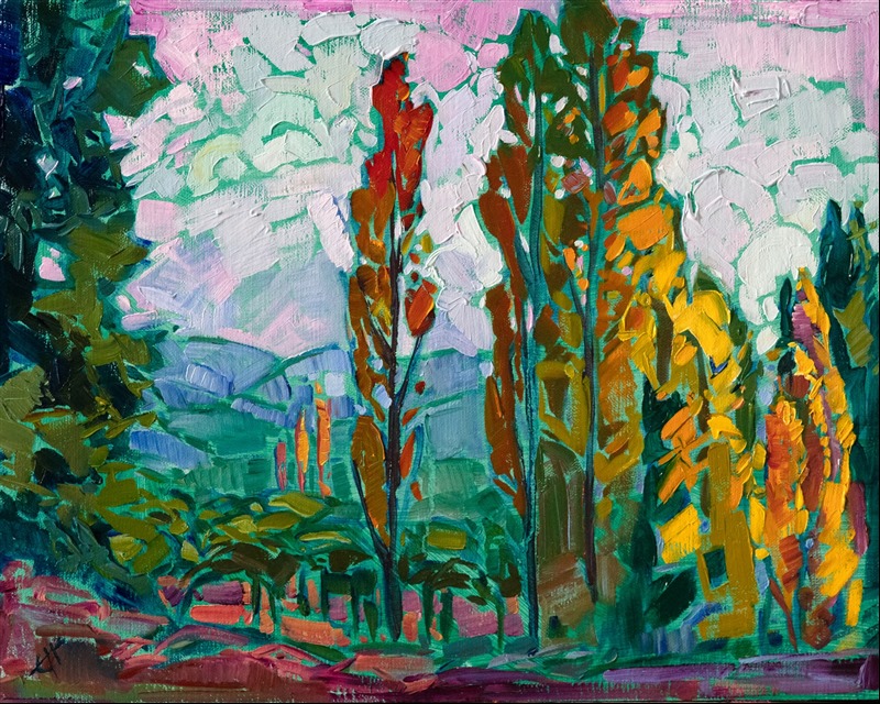 Note on varnishing: Erin’s paintings take six to eight weeks to dry, at which time we apply a retouching varnish, which allows the painting to complete the curing process while having a layer of protection against dirt and scuffs. The full curing process for an impasto oil painting takes at least two years. We are happy to assist in applying a final finishing varnish to your Erin Hanson oil painting once it has been dry for at least two years. Here is more information on how to care for your original oil painting.