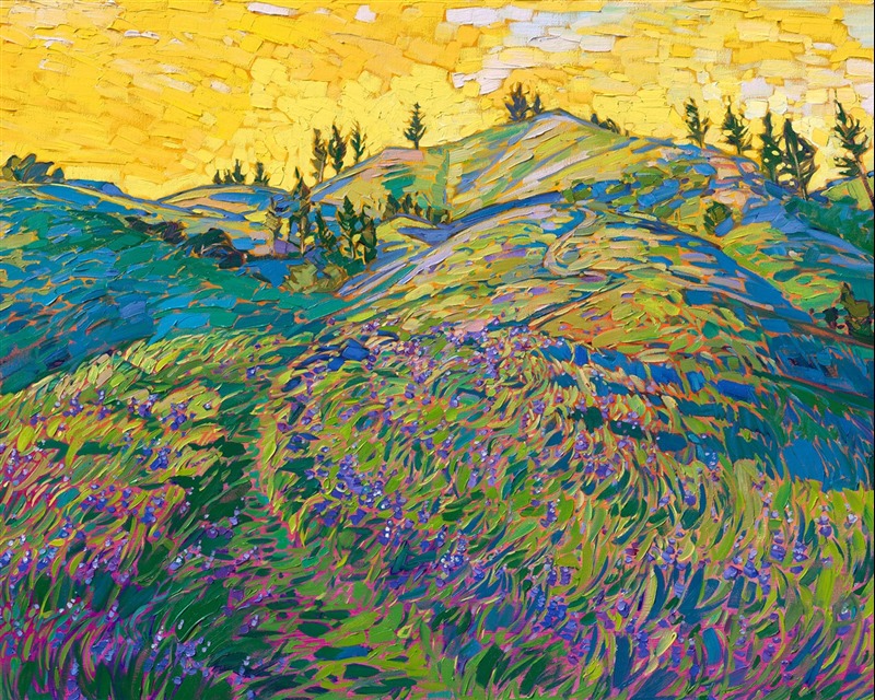 Style: "Open Impressionism" is a new style of painting developed by American artist Erin Hanson. The style is characterized by short, impasto brush strokes that are applied without layering, creating a mosaic or stained-glass appearance to the paintings. The paintings are created with a limited palette of colors, applied without blending or mixing upon the canvas, which adds a dimension of texture to each brush stroke. Inspired by classic impressionism, pointillism, and post-impressionism, Erin Hanson continues the tradition of impressionism into the modern day with her colorful and vivacious landscape paintings.