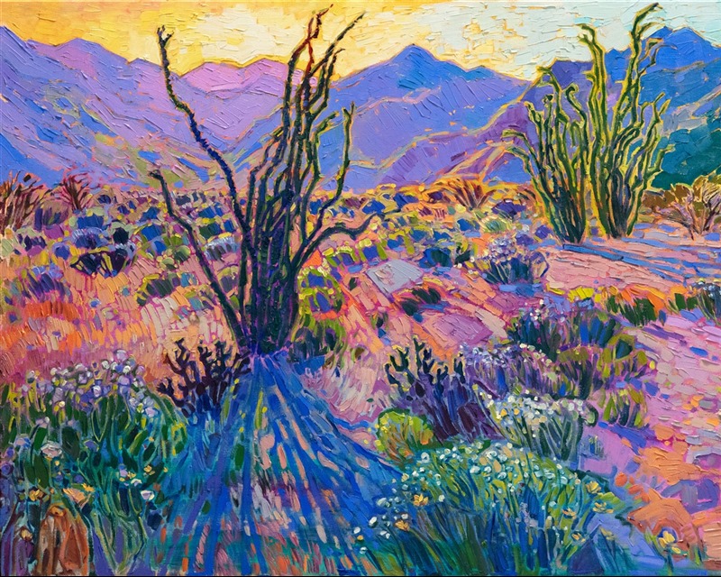 A California desert super bloom is captured in brilliant color in this contemporary impressionist painting. This piece was inspired by Borrego Springs, near Palm Springs. Thick brush strokes convey a sense of movement and life throughout the painting.