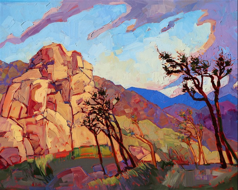 Style: "Open Impressionism" is a new style of painting developed by American artist Erin Hanson. The style is characterized by short, impasto brush strokes that are applied without layering, creating a mosaic or stained-glass appearance to the paintings. The paintings are created with a limited palette of colors, applied without blending or mixing upon the canvas, which adds a dimension of texture to each brush stroke. Inspired by classic impressionism, pointillism, and post-impressionism, Erin Hanson continues the tradition of impressionism into the modern day with her colorful and vivacious landscape paintings.