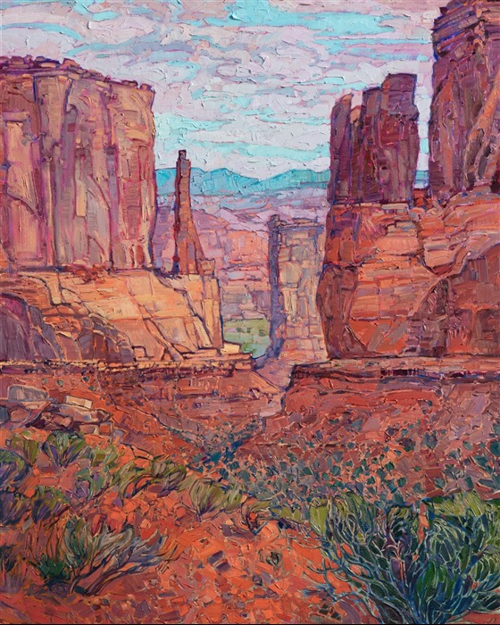This painting captures the dramatic vista seen when you first enter Arches National Park. Hiking down into the canyon between the red rock fins towering above on either side is a surreal experience. The landscape is drenched in color, the red sandstone appearing in a multitude of colors ranging from soft buttercream to sherbet orange to pale lavender.