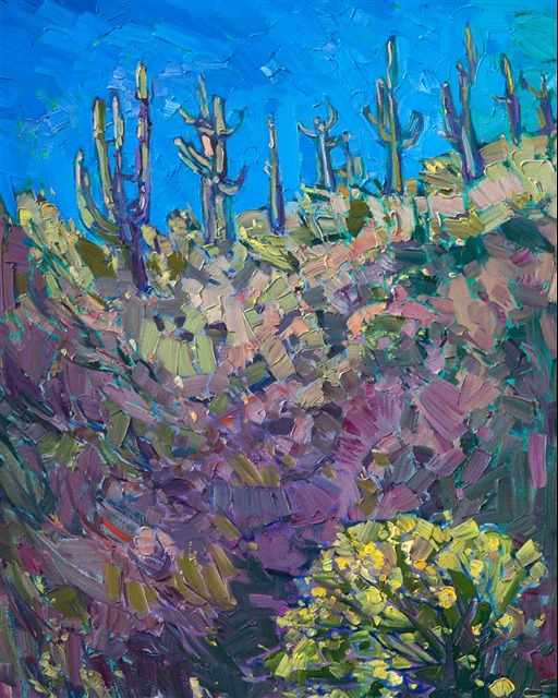 Note on varnishing: Erin’s paintings take six to eight weeks to dry, at which time we apply a retouching varnish, which allows the painting to complete the curing process while having a layer of protection against dirt and scuffs. The full curing process for an impasto oil painting takes at least two years. We are happy to assist in applying a final finishing varnish to your Erin Hanson oil painting once it has been dry for at least two years. Here is more information on how to care for your original oil painting.