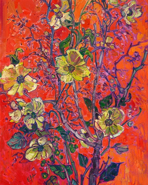 Framing: "Dogwood on Red" is an original oil painting on stretched canvas. The piece arrives framed in a wooden floater frame finished in 23kt gold.