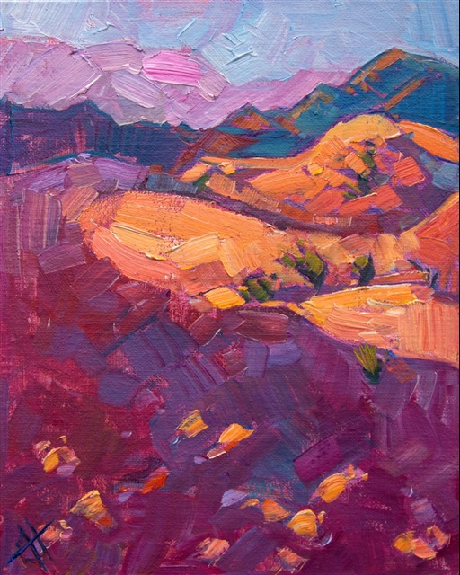 Style: "Open Impressionism" is a new style of painting developed by American artist Erin Hanson. The style is characterized by short, impasto brush strokes that are applied without layering, creating a mosaic or stained-glass appearance to the paintings. The paintings are created with a limited palette of colors, applied without blending or mixing upon the canvas, which adds a dimension of texture to each brush stroke. Inspired by classic impressionism, pointillism, and post-impressionism, Erin Hanson continues the tradition of impressionism into the modern day with her colorful and vivacious landscape paintings.
