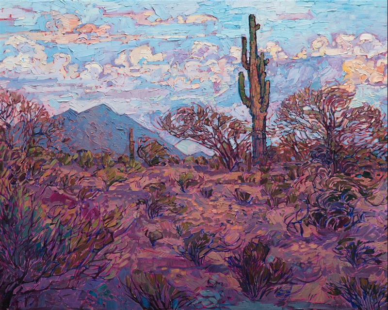 Note on varnishing: Erin’s paintings take six to eight weeks to dry, at which time we apply a retouching varnish, which allows the painting to complete the curing process while having a layer of protection against dirt and scuffs. The full curing process for an impasto oil painting takes at least two years. We are happy to assist in applying a final finishing varnish to your Erin Hanson oil painting once it has been dry for at least two years. Here is more information on how to care for your original oil painting.