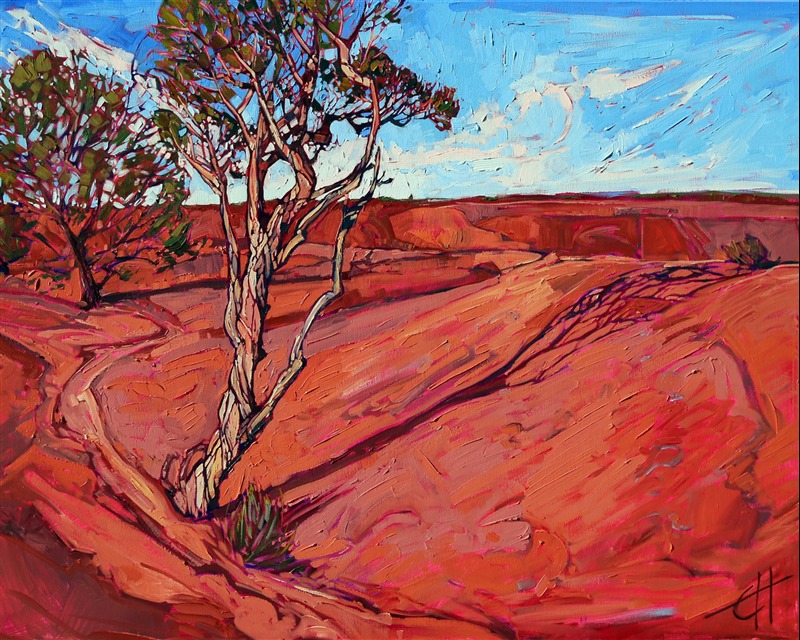 Long afternoon shadows stretch across the high sandstone cliffs of Canyon de Chelly, the red sandstone baking in the late sun. The spindly evergreens stretch and curl into the hot desert air. This oil painting captures the movement and feel of hiking the rim of Canyon de Chelly.