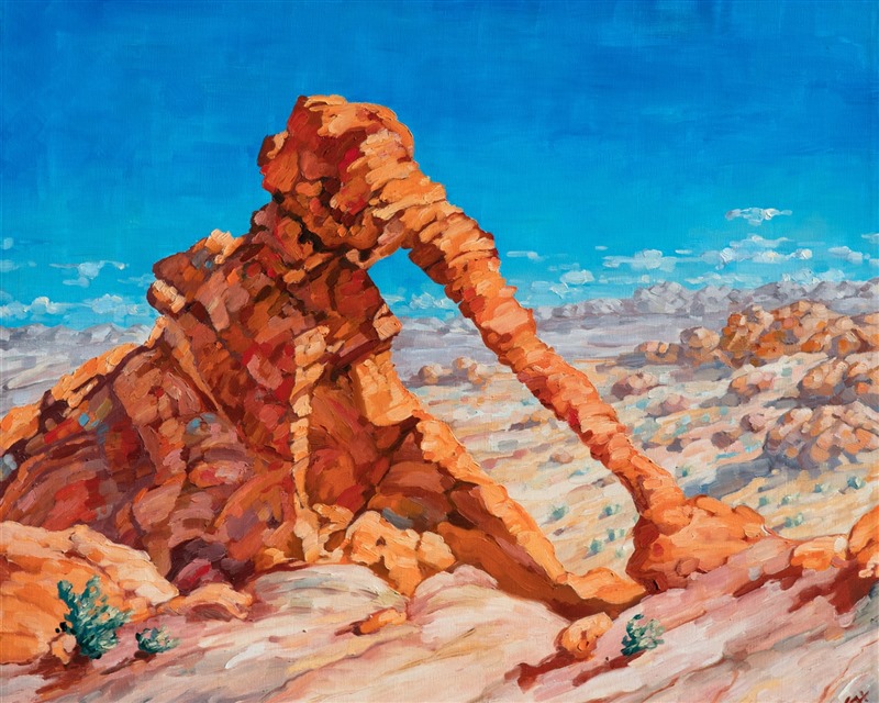 This early example of Open Impressionism was created in Las Vegas, Nevada. This is a painting of "Elephant Rock," an animal-shaped rock formation in Valley of Fire State Park, an hour north of Vegas. Notice the smoothly blended brush strokes and lack of an underpainting.