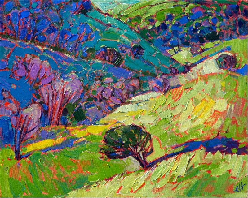 Style: "Open Impressionism" is a new style of painting developed by American artist Erin Hanson. The style is characterized by short, impasto brush strokes that are applied without layering, creating a mosaic or stained-glass appearance to the paintings. The paintings are created with a limited palette of colors, applied without blending or mixing upon the canvas, which adds a dimension of texture to each brush stroke. Inspired by classic impressionism, pointillism, and post-impressionism, Erin Hanson continues the tradition of impressionism into the modern day with her colorful and vivacious landscape paintings.