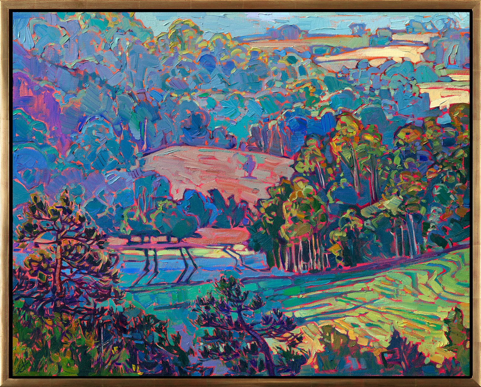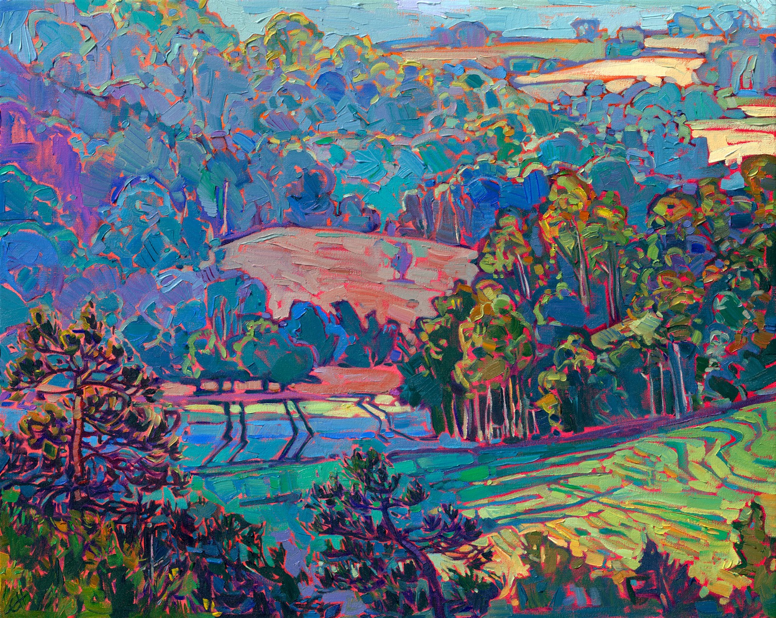 Style: "Open Impressionism" is a new style of painting developed by American artist Erin Hanson. The style is characterized by short, impasto brush strokes that are applied without layering, creating a mosaic or stained-glass appearance to the paintings. The paintings are created with a limited palette of colors, applied without blending or mixing upon the canvas, which adds a dimension of texture to each brush stroke. Inspired by classic impressionism, pointillism, and post-impressionism, Erin Hanson continues the tradition of impressionism into the modern day with her colorful and vivacious landscape paintings.