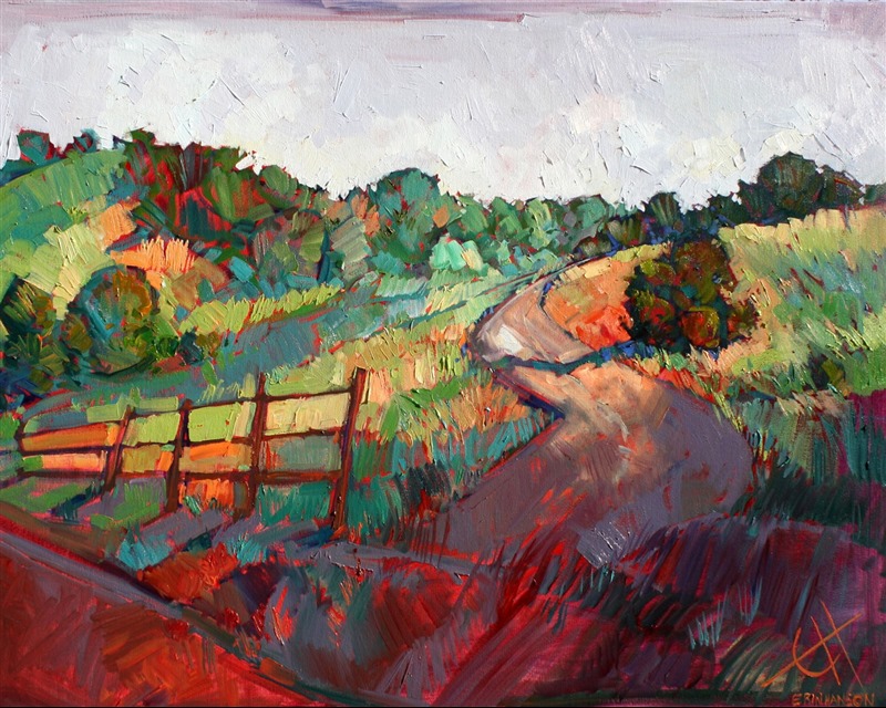 Chasing after fences in Paso Robles will always lead an artist to beautiful new vistas to paint. The vintage wooden fences add an abstract feel to an impressionist landscape.