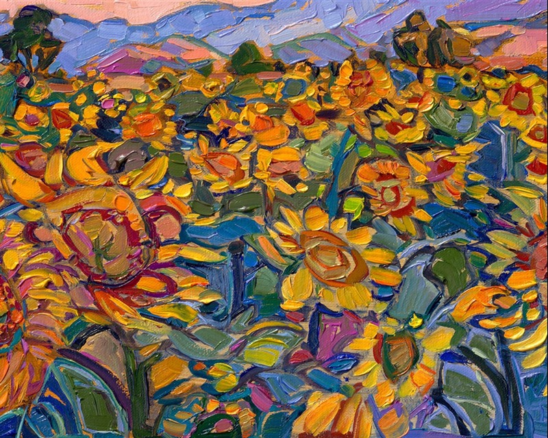 Style: "Open Impressionism" is a new style of painting developed by American artist Erin Hanson. The style is characterized by short, impasto brush strokes that are applied without layering, creating a mosaic or stained-glass appearance to the paintings. The paintings are created with a limited palette of colors, applied without blending or mixing upon the canvas, which adds a dimension of texture to each brush stroke. Inspired by classic impressionism, pointillism, and post-impressionism, Erin Hanson continues the tradition of impressionism into the modern day with her colorful and vivacious landscape paintings.