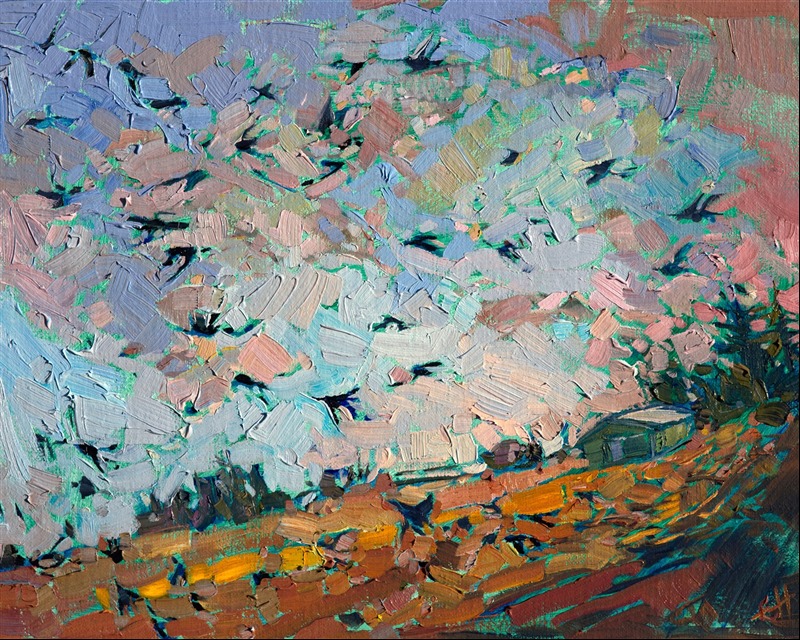 Note on varnishing: Erin’s paintings take six to eight weeks to dry, at which time we apply a retouching varnish, which allows the painting to complete the curing process while having a layer of protection against dirt and scuffs. The full curing process for an impasto oil painting takes at least two years. We are happy to assist in applying a final finishing varnish to your Erin Hanson oil painting once it has been dry for at least two years. Here is more information on how to care for your original oil painting.