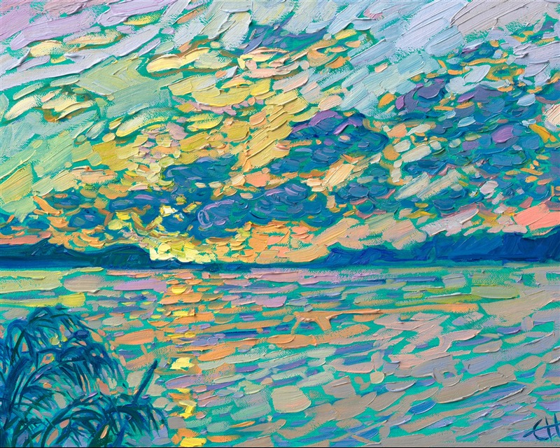 Note on varnishing: Erin’s paintings take six to eight weeks to dry, at which time we apply a retouching varnish, which allows the painting to complete the curing process while having a layer of protection against dirt and scuffs. The full curing process for an impasto oil painting takes at least two years. We are happy to assist in applying a final finishing varnish to your Erin Hanson oil painting once it has been dry for at least two years. Here is more information on how to care for your original oil painting.