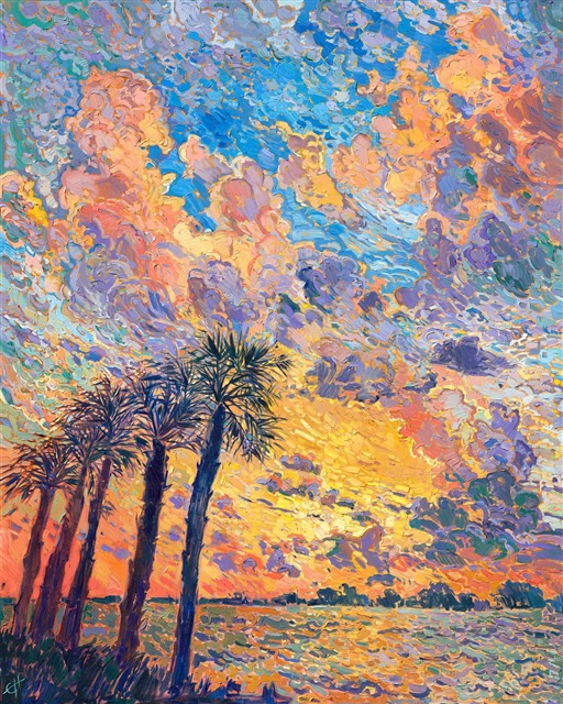Framing: "Florida Sky" is an original oil painting on 1-1/2" canvas. The painting arrives framed in a wood floater frame finished in 23KT, burnished gold leaf.