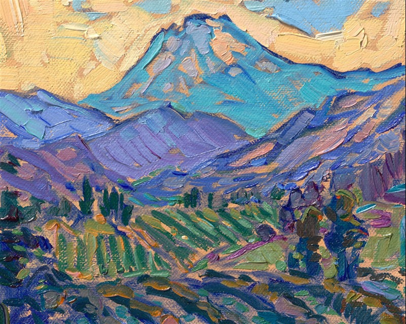This miniature painting, only 6x6 inches, captures a wide vista of vineyards and fruit orchards growing at the base of Mt Hood, in the Hood River Valley, AKA the "Fruit Loop." Small brush strokes create big impact and lots of texture, since Erin does not overlap her brush strokes.