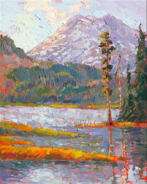 Note on varnishing: Erin’s paintings take six to eight weeks to dry, at which time we apply a retouching varnish, which allows the painting to complete the curing process while having a layer of protection against dirt and scuffs. The full curing process for an impasto oil painting takes at least two years. We are happy to assist in applying a final finishing varnish to your Erin Hanson oil painting once it has been dry for at least two years. Here is more information on how to care for your original oil painting.