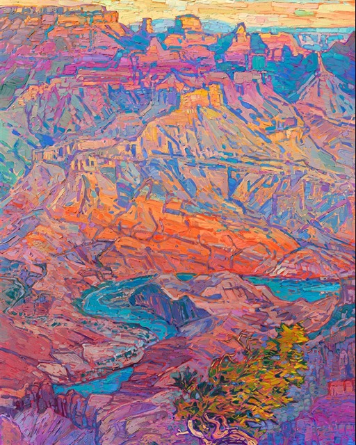 "Grand Canyon Light" is an original oil painting by Erin Hanson, created on 1-1/2"-deep stretched canvas. The piece arrives in a hand-made, closed corner floater frame finished in burnished, 23kt gold leaf.