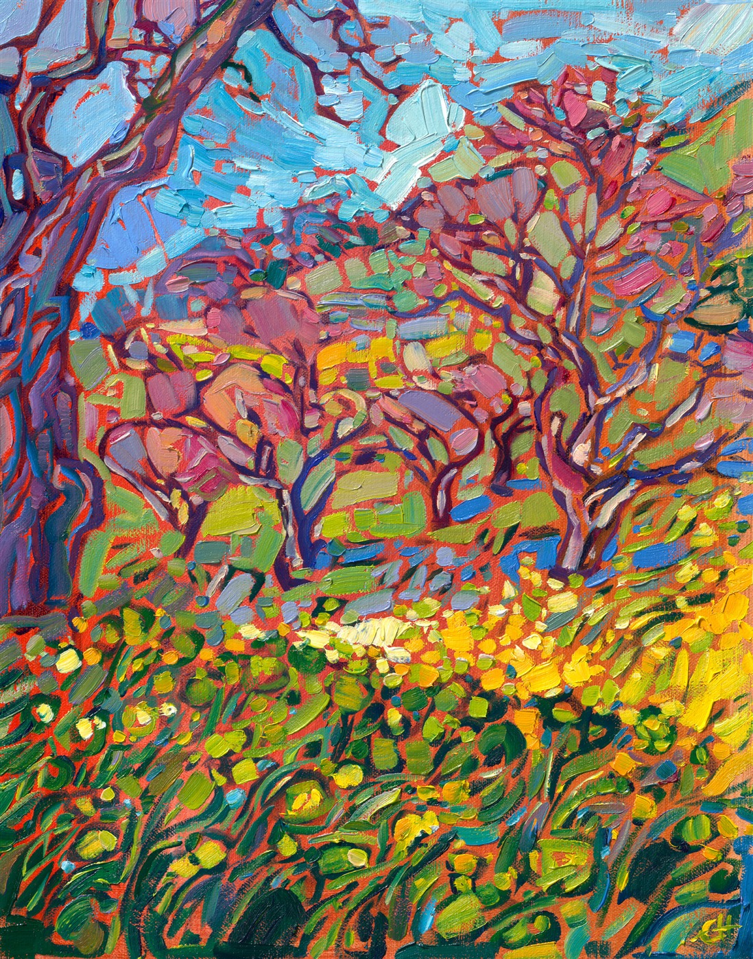 Erin devoted three years to perfecting the technology of 3D art printing in a quest to create a fine art print that captured her vibrant colors and reproduced the texture crucial to her artistic vision. The rhythms of texture in her luscious, impasto oil paintings communicate the movement and joy she finds in nature.