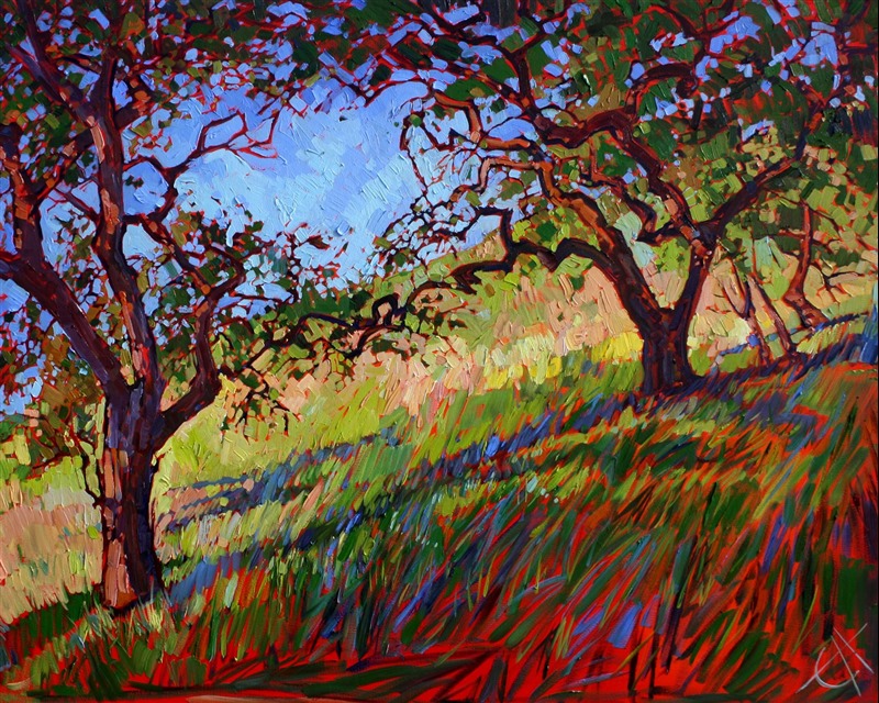 Style: "Open Impressionism" is a new style of painting developed by American artist Erin Hanson. The style is characterized by short, impasto brush strokes that are applied without layering, creating a mosaic or stained-glass appearance to the paintings. The paintings are created with a limited palette of colors, applied without blending or mixing upon the canvas, which adds a dimension of texture to each brush stroke. Inspired by classic impressionism, pointillism, and post-impressionism, Erin Hanson continues the tradition of impressionism into the modern day with her colorful and vivacious landscape paintings.