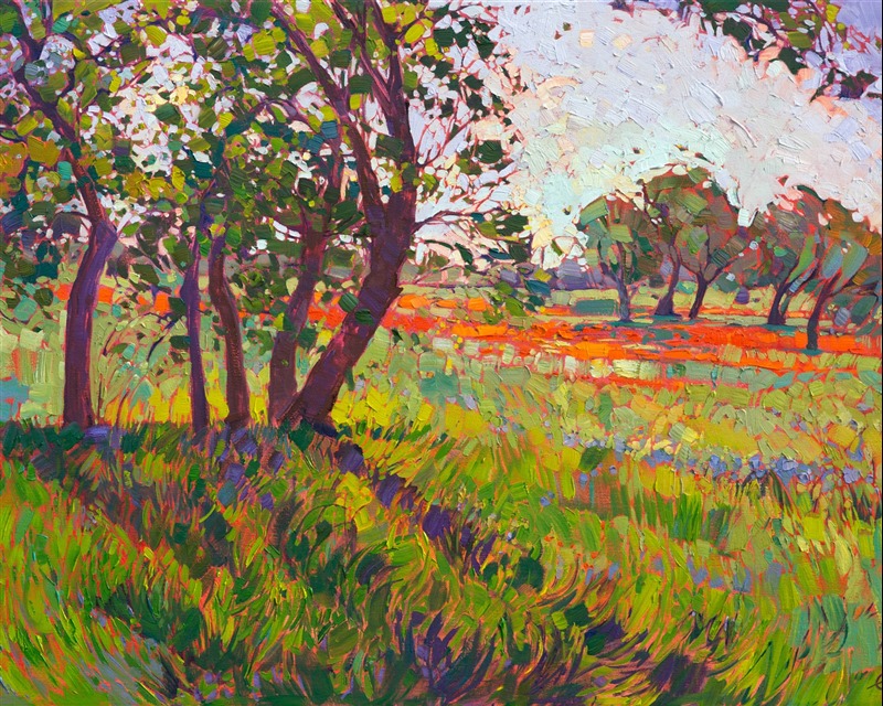 Style: "Open Impressionism" is a new style of painting developed by American artist Erin Hanson. The style is characterized by short, impasto brush strokes that are applied without layering, creating a mosaic or stained-glass appearance to the paintings. The paintings are created with a limited palette of colors, applied without blending or mixing upon the canvas, which adds a dimension of texture to each brush stroke. Inspired by classic impressionism, pointillism, and post-impressionism, Erin Hanson continues the tradition of impressionism into the modern day with her colorful and vivacious landscape paintings.