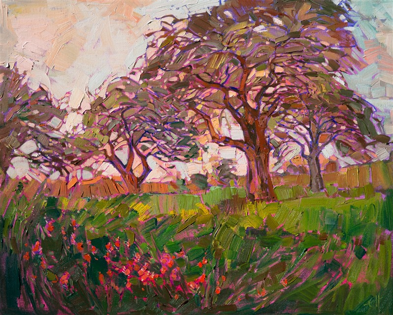 Style: "Open Impressionism" is a new style of painting developed by American artist Erin Hanson. The style is characterized by short, impasto brush strokes that are applied without layering, creating a mosaic or stained-glass appearance to the paintings. The paintings are created with a limited palette of colors, applied without blending or mixing upon the canvas, which adds a dimension of texture to each brush stroke. Inspired by classic impressionism, pointillism, and post-impressionism, Erin Hanson continues the tradition of impressionism into the modern day with her colorful and vivacious landscape paintings.