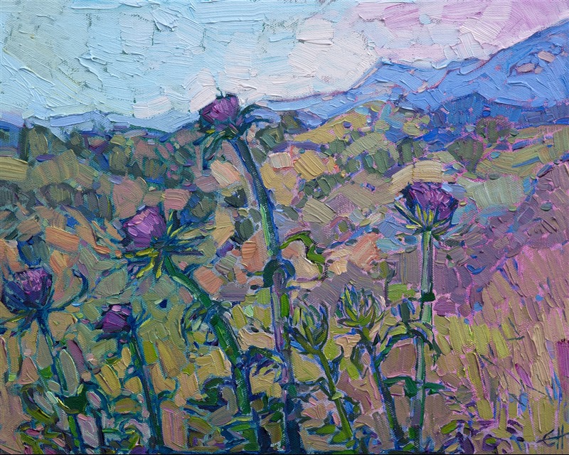 Note on varnishing: Erin’s paintings take six to eight weeks to dry, at which time we apply a retouching varnish, which allows the painting to complete the curing process while having a layer of protection against dirt and scuffs. The full curing process for an impasto oil painting takes at least two years. We are happy to assist in applying a final finishing varnish to your Erin Hanson oil painting once it has been dry for at least two years. Here is more information on how to care for your original oil painting.