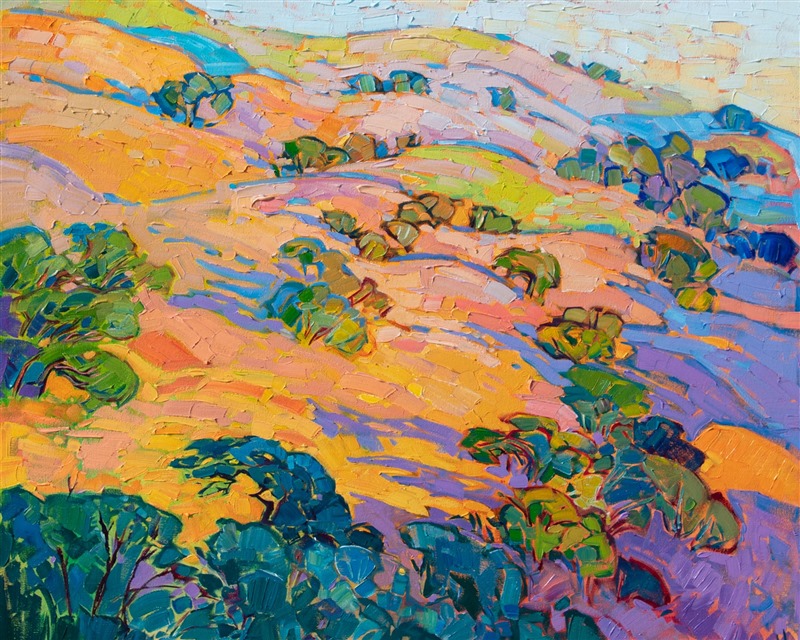 "Hills at Dawn" was created in Erin's Open Impressionist style, with thickly applied paint and defined brushstrokes. Each color was mixed from a limited palette of only 5 primary colors. The thick, impasto paint lends dimension to the canvas. The piece was created on 1-1/2" canvas, with the painting continued around the edges. The painting arrives framed in a simple gold-leaf floater frame.