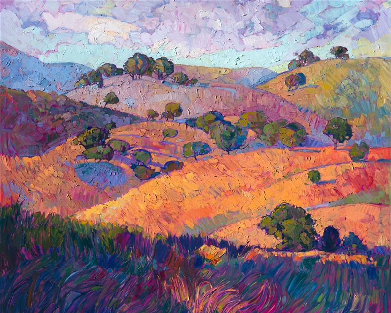 Style: "Open Impressionism" is a new style of painting developed by American artist Erin Hanson. The style is characterized by short, impasto brush strokes that are applied without layering, creating a mosaic or stained-glass appearance to the paintings. The paintings are created with a limited palette of colors, applied without blending or mixing upon the canvas, which adds a dimension of texture to each brush stroke. Inspired by classic impressionism, pointillism, and post-impressionism, Erin Hanson continues the tradition of impressionism into the modern day with her colorful and vivacious landscape paintings.