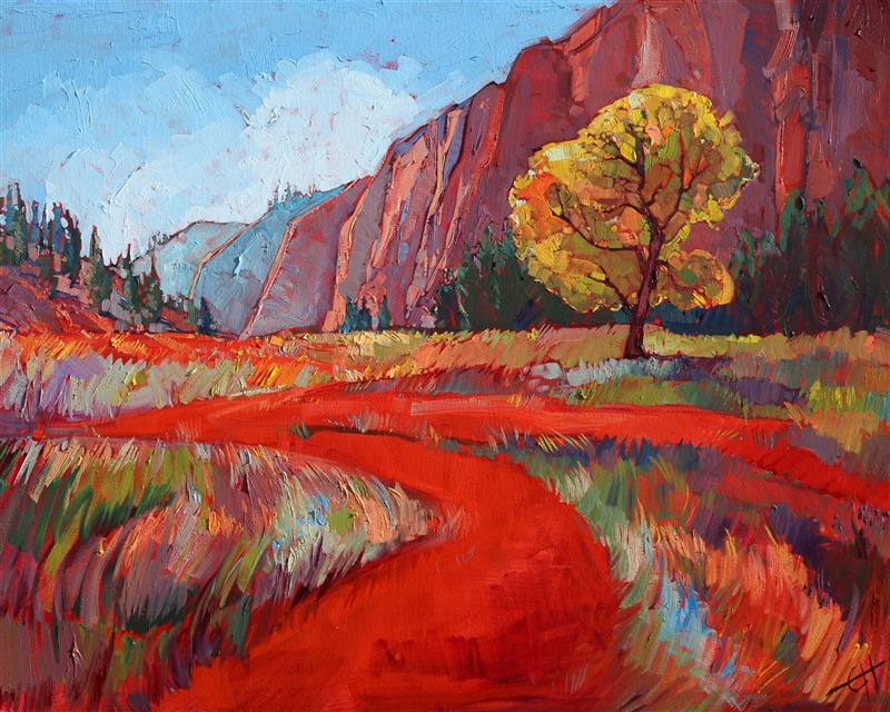 Style: "Open Impressionism" is a new style of painting developed by American artist Erin Hanson. The style is characterized by short, impasto brush strokes that are applied without layering, creating a mosaic or stained-glass appearance to the paintings. The paintings are created with a limited palette of colors, applied without blending or mixing upon the canvas, which adds a dimension of texture to each brush stroke. Inspired by classic impressionism, pointillism, and post-impressionism, Erin Hanson continues the tradition of impressionism into the modern day with her colorful and vivacious landscape paintings.